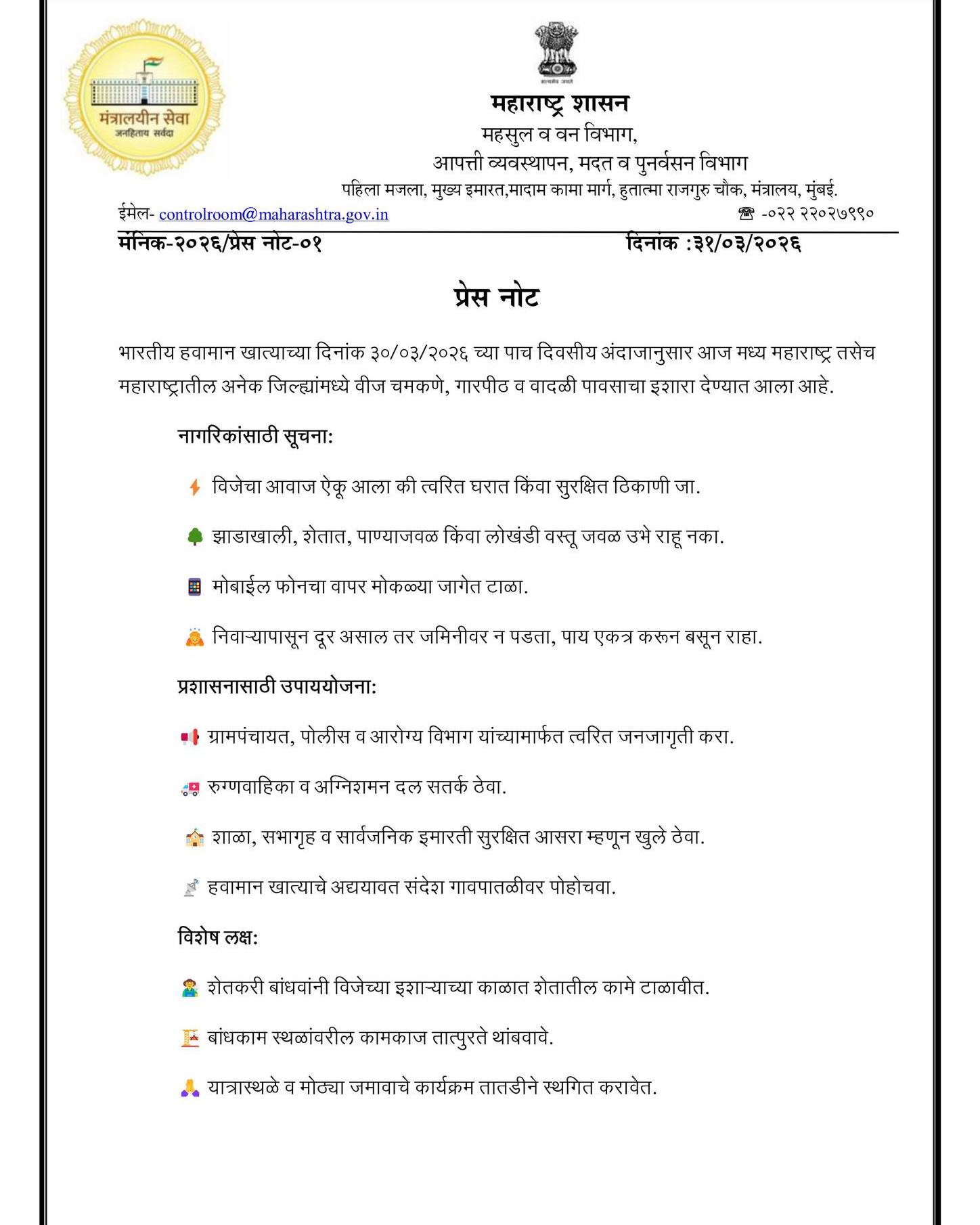 भारतीय हवामान खात्याच्या ३० मार्च २०२६ रोजीच्या पाच दिवसीय अंदाजानुसार आज मध्य महाराष्ट्रासह राज्यातील अनेक जिल्ह्यांमध्ये वीज चमकणे, गारपीट आणि वादळी पावसाचा इशारा March 31, 2026 No Comments